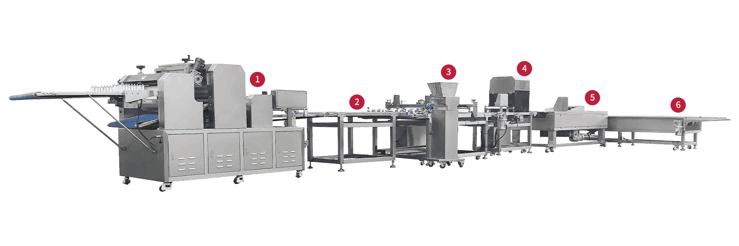 Výrobná linka sa skladá z stroja na tvorbu pečiva ST-868-600, štvorkanálový posunkový stroj, štvorkanálový múkový valcovací stroj, štvorkanálový koncentračný stroj CT-QT450 Double Servo Servo Dusený kusový stolík na chlieb a CT-WP500 Horizontal Plate Stroj (Model 500). PATE